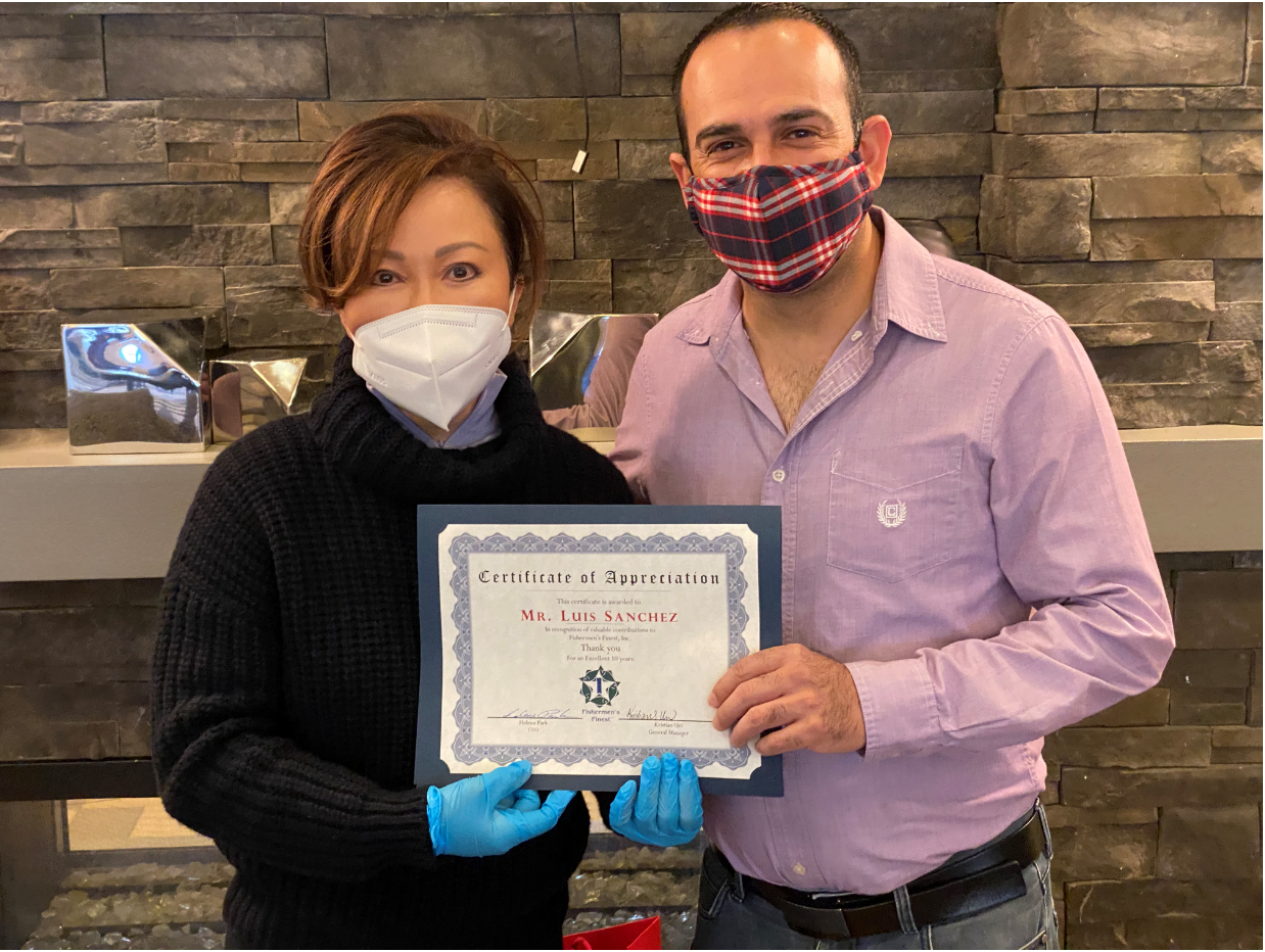 While feeding our hotel quarantine crew dinner on Saturday, Ms. Park took a moment to recognize Luis Sanchez for ten years of service to Fishermen’s Finest.