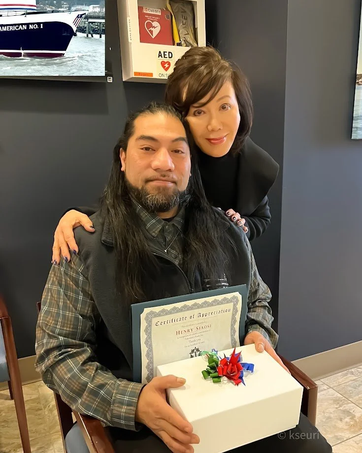 Henry and Ms. Park at Fishermen’s Finest Anacortes January 2017; recognition as a Man of Steel