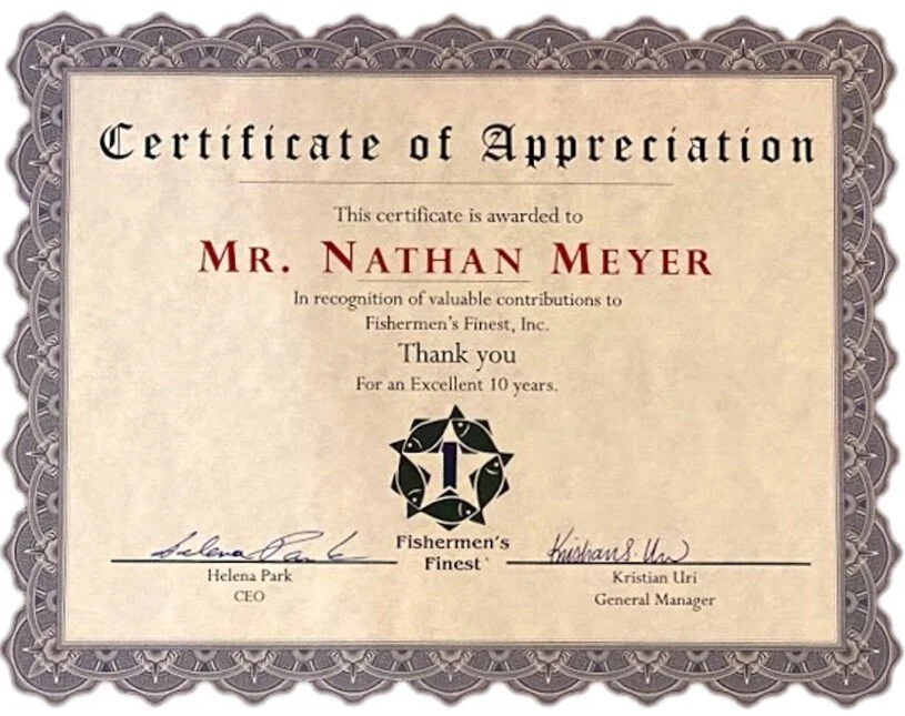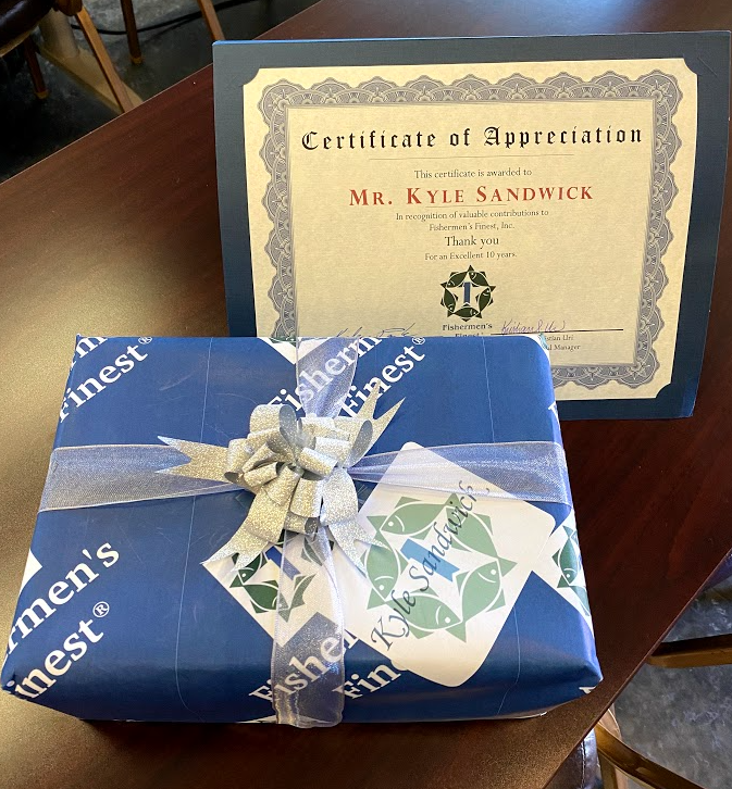 Fishermen’s Finest took a moment on June 22, 2021 to recognize Kyle Sandwick for ten years of service. Kyle was at FishFinest MUK (our Mukilteo warehouse and pandemic operations office) for his Abbott ID NOW PCR test and Kristian Uri presented him with a gift from Ms. Park - our customary Omega Seamaster ‘James Bond’ self-winding watch.