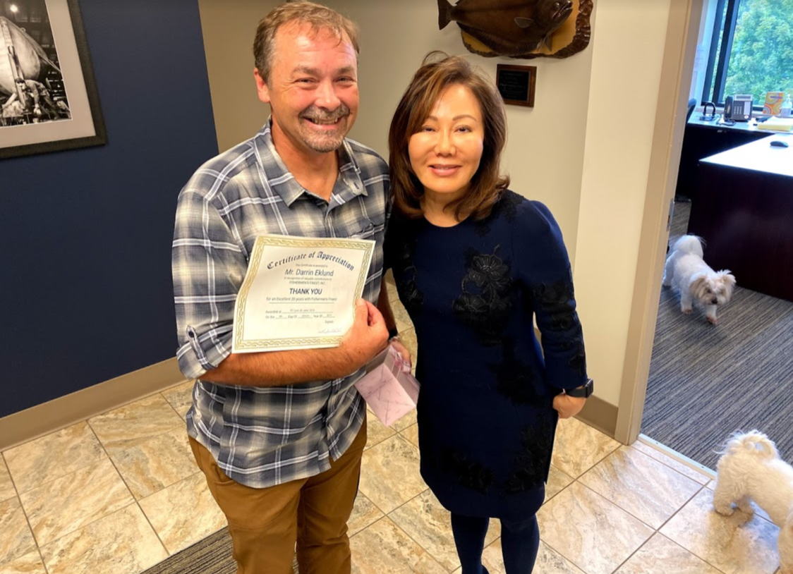Circling back to recognize our long-time employee Darrin Eklund who was recognized by Ms. Park at our Joie De Vivre 2019 party at the Hyatt Regency Bellevue January 4, 2019. Starting as a Fish Processor, he worked his way up to Deckhand, First Mate, and now Captain.
