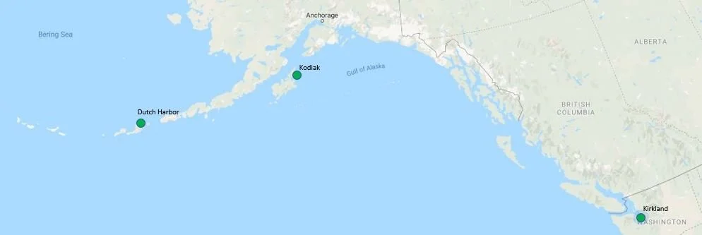 Left to Right: Unalaska port of Dutch Harbor, Kodiak, Kirkland.